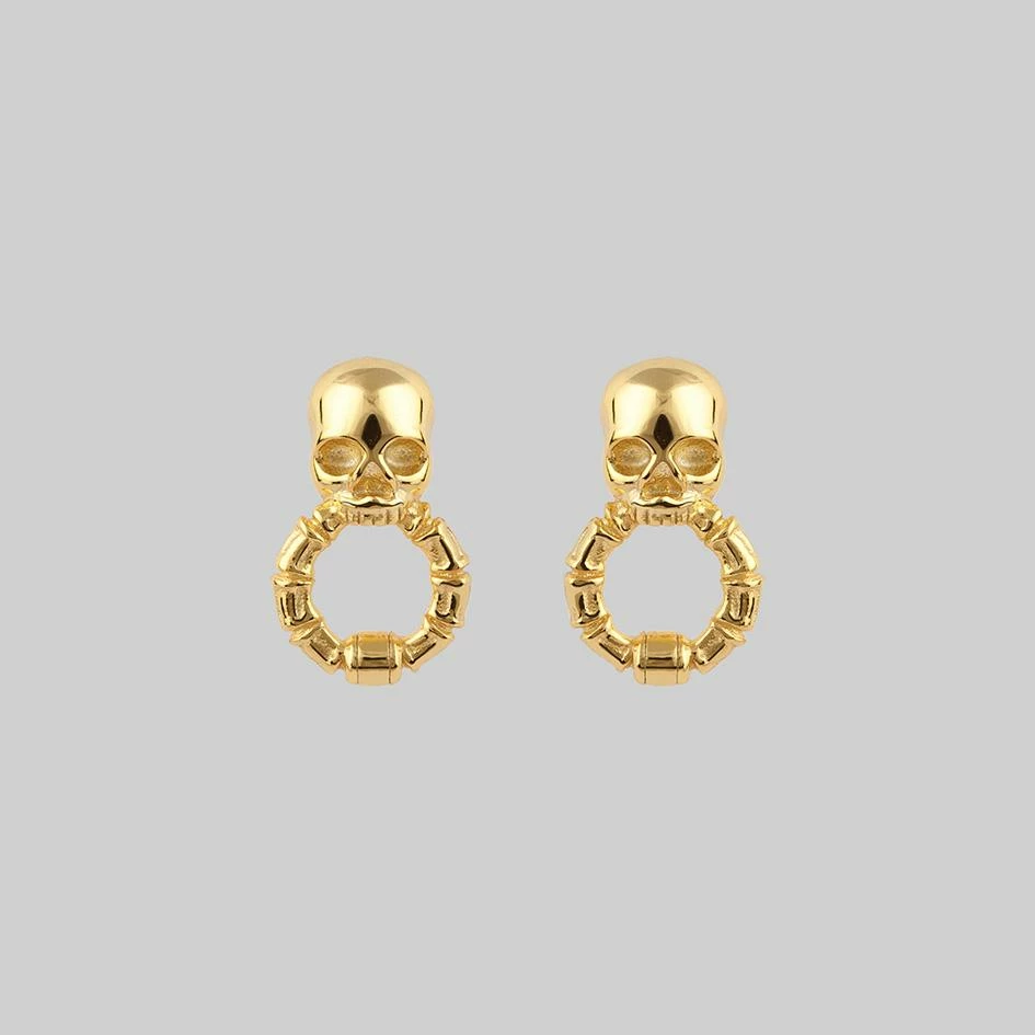 Scary or Cute? We can’t decide! Detailed gold skull & bone door knocker style stud earrings.