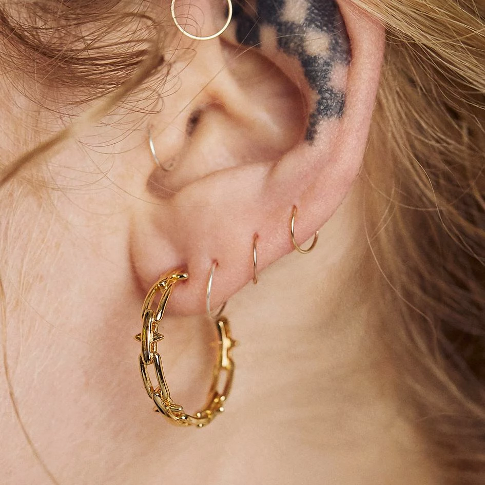 Gold spiked chain hoop earrings.