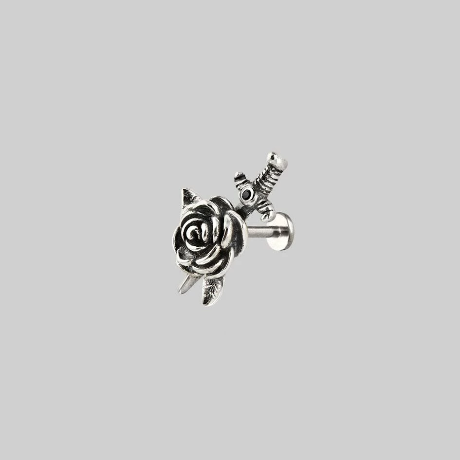 Dangerously detailed rose and dagger ear stud featuring a tiny Black Spinel gemstone.