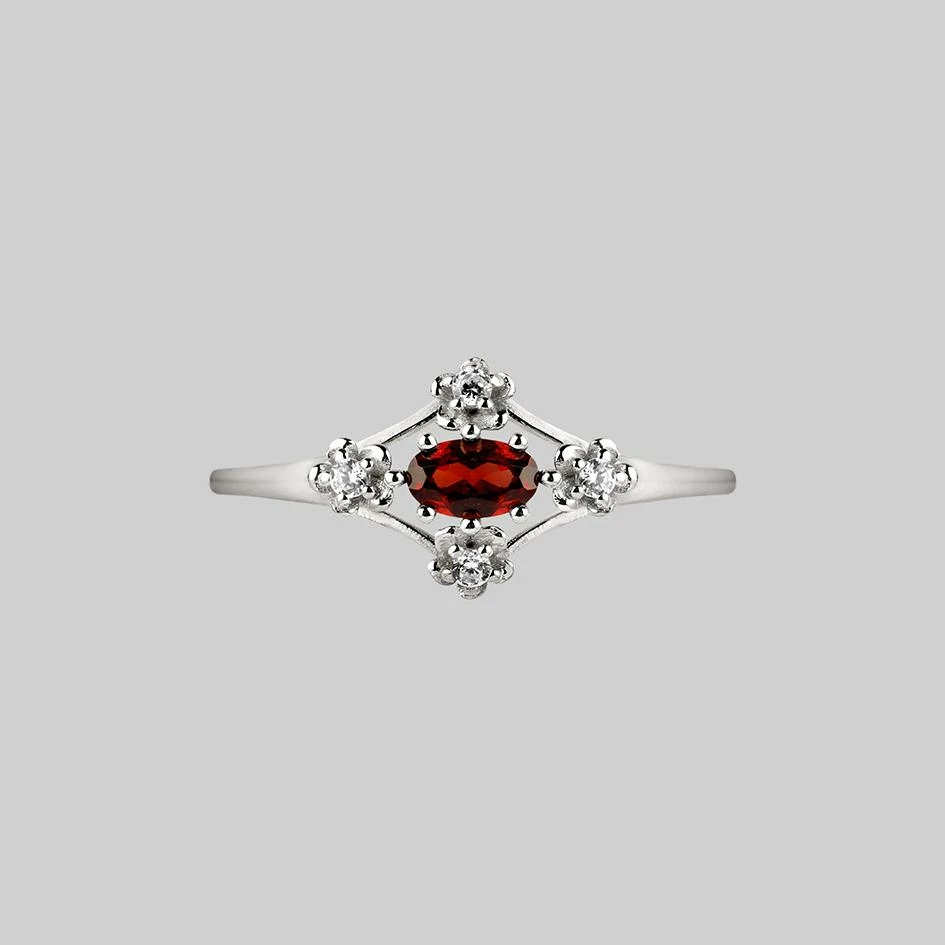 An elegant Gothic style ring featuring floral detailing with CZ around a deep red Garnet gemstone.