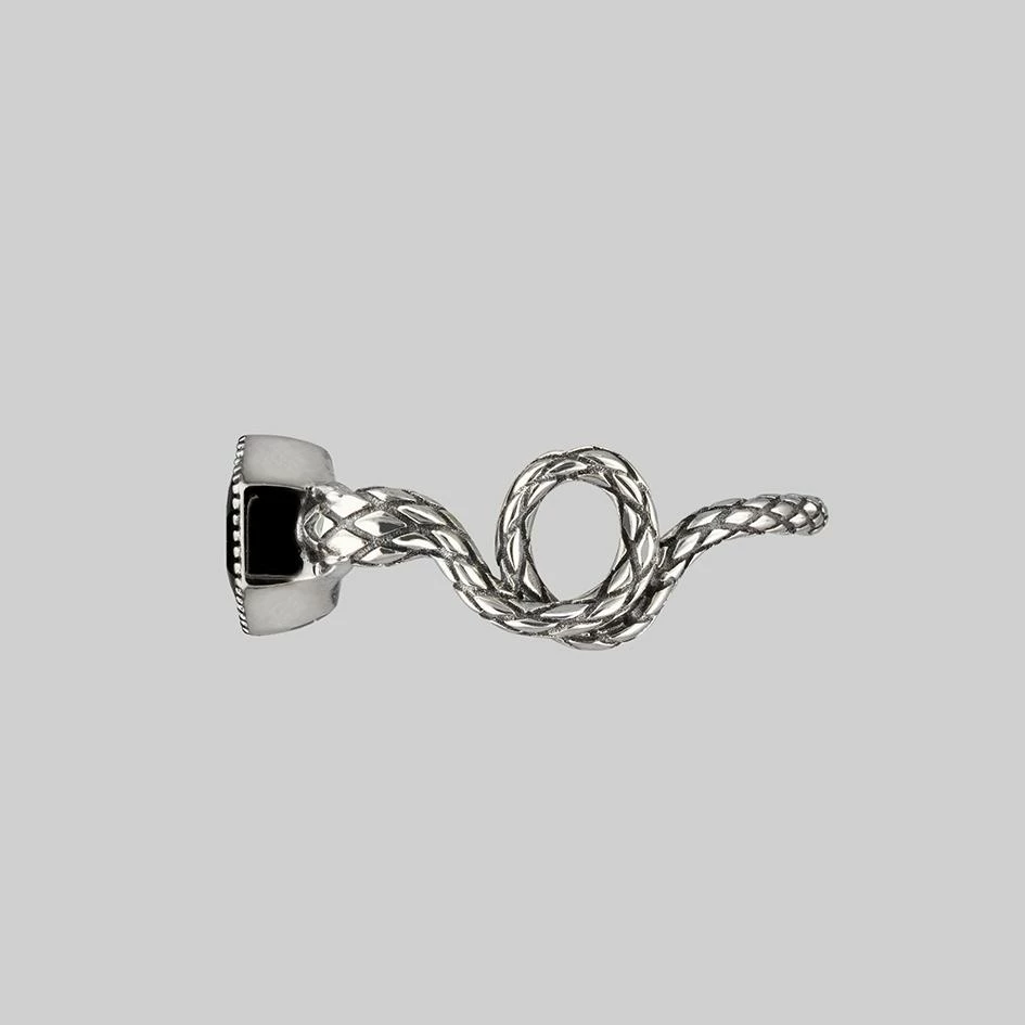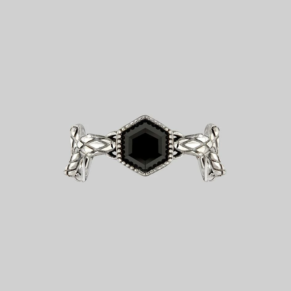 Two deadly coiled snake heads with rings hold a bezel set hexagon cut Onyx gemstone.