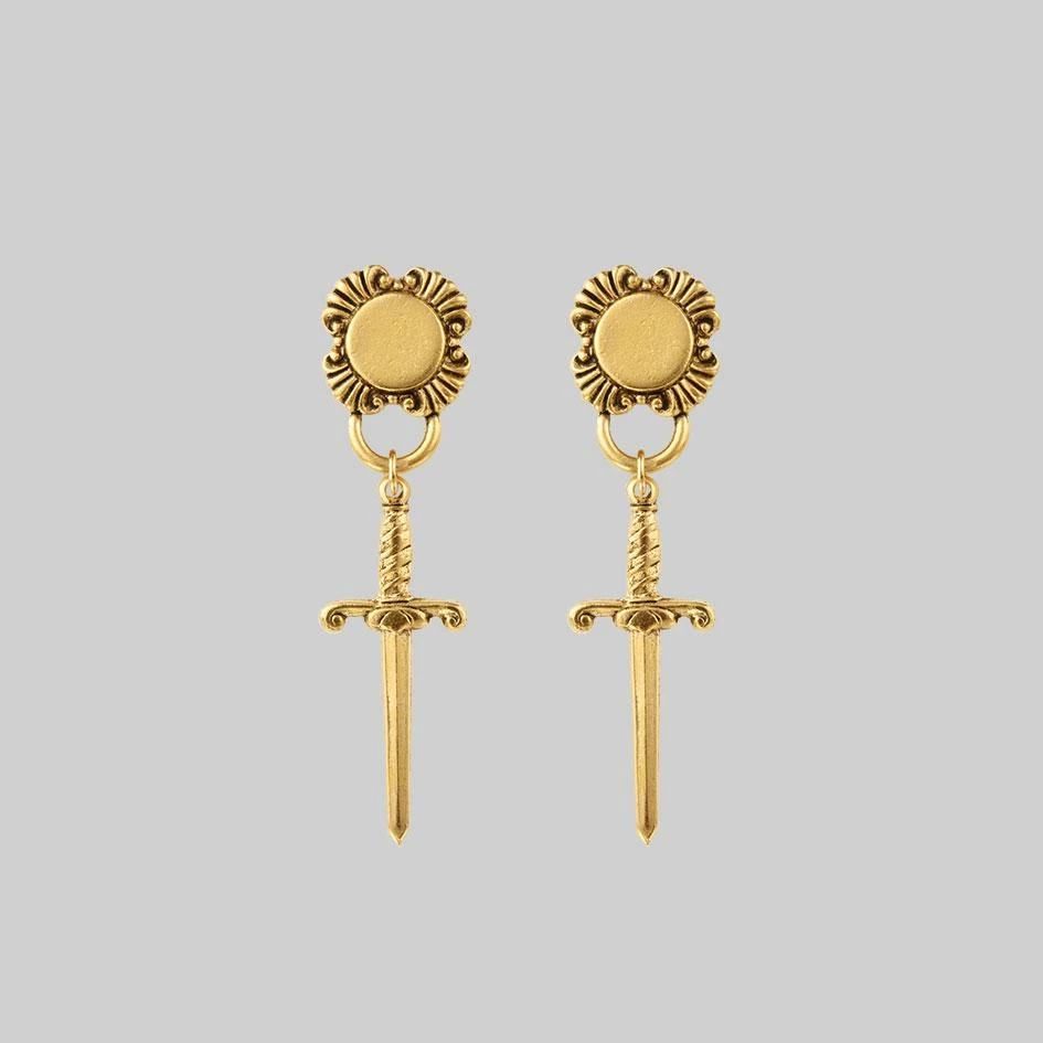 Ornnate shield and sword earrings.