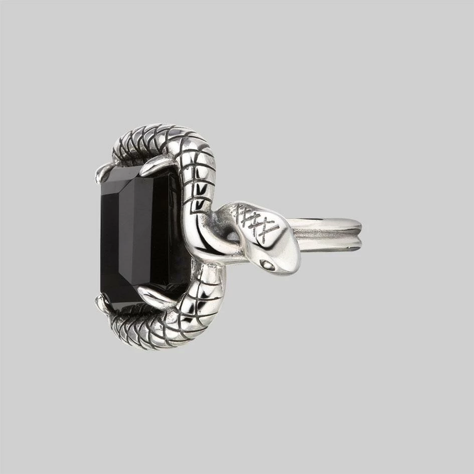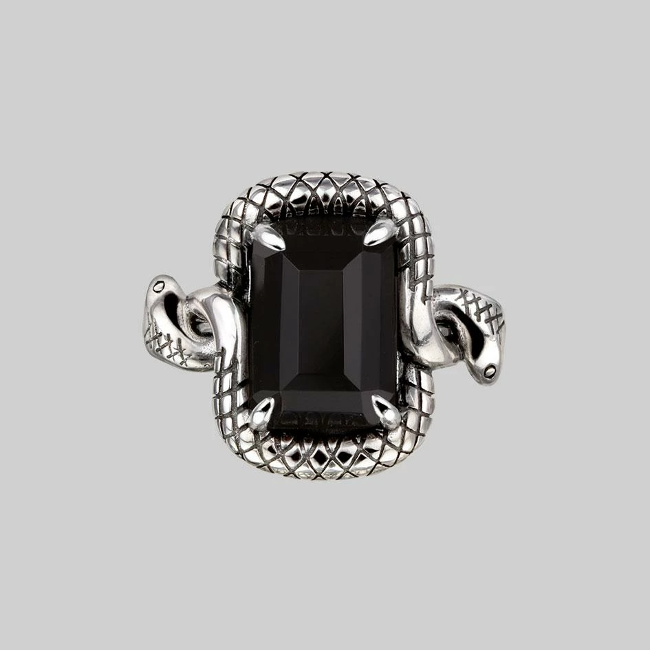 Two venomous snakes twist and twirl around a large rectangle cut Black Spinel gemstone in this perfectly poised cocktail ring. A Black Friday Exclusive!
