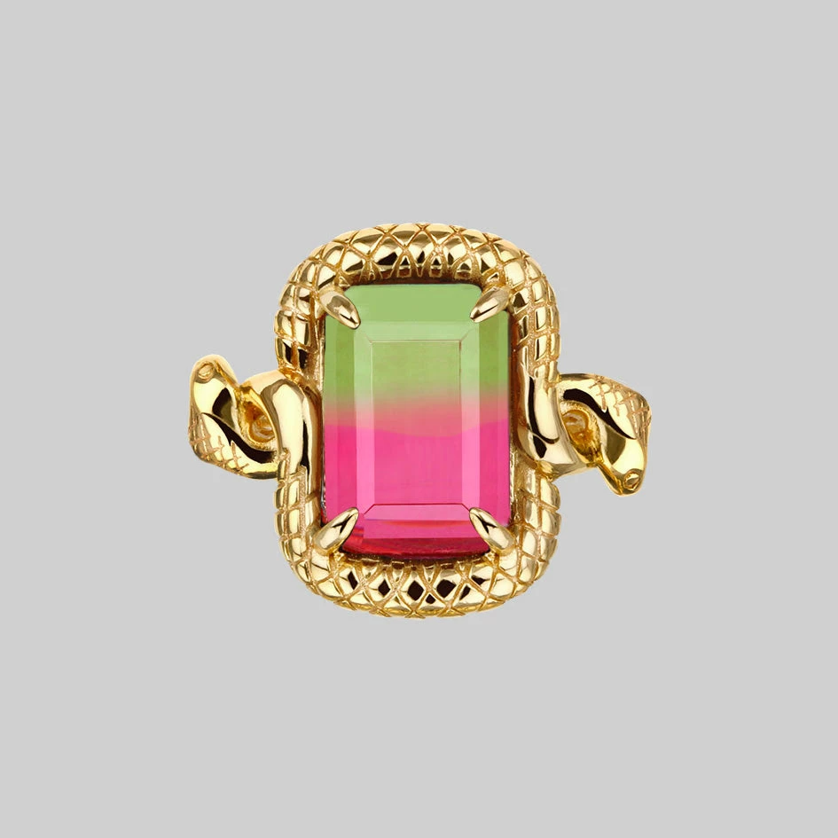 Two venomous snakes twist and twirl around a large rectangle cut Tourmaline CZ gemstone in this perfectly poised cocktail ring. A Black Friday Exclusive!