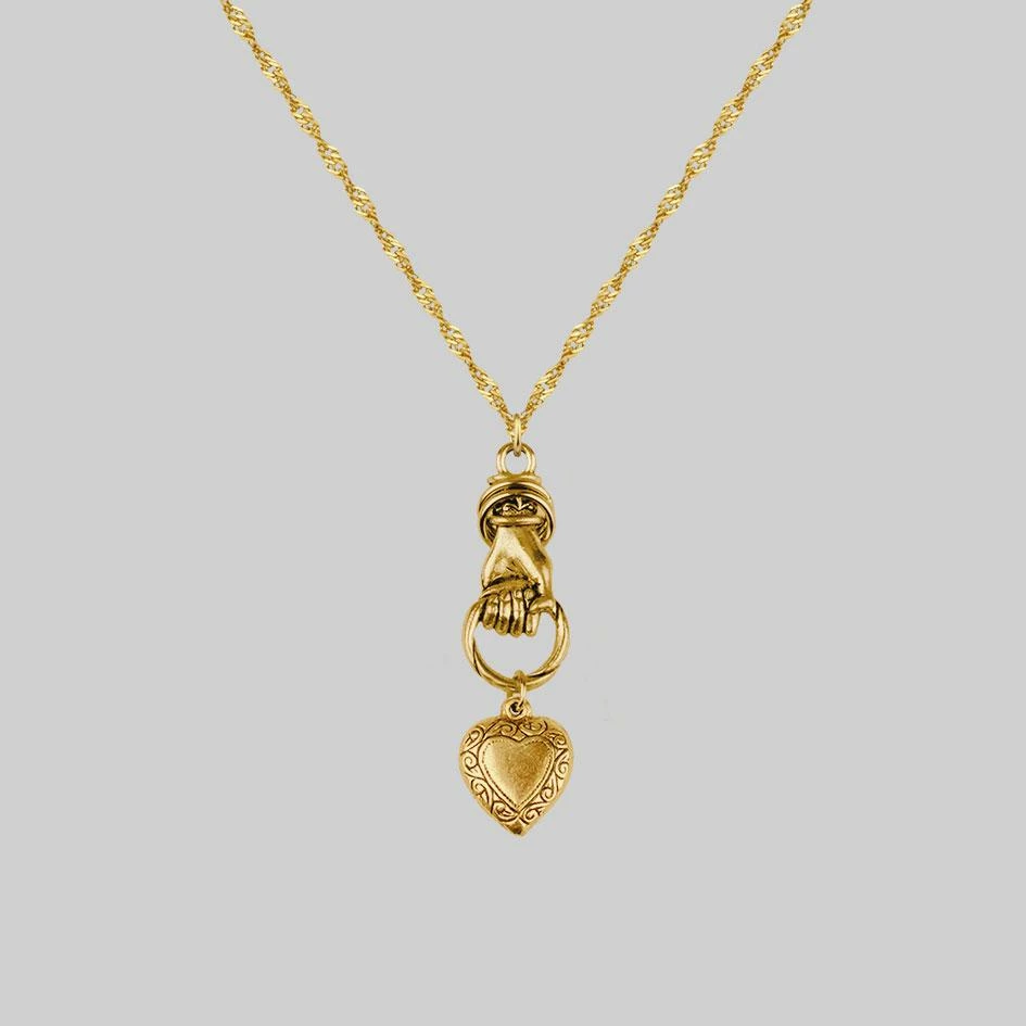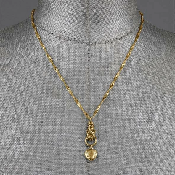 A beautifully detailed hand charm grasping a dangling heart, hangs on a Singapore style chain.