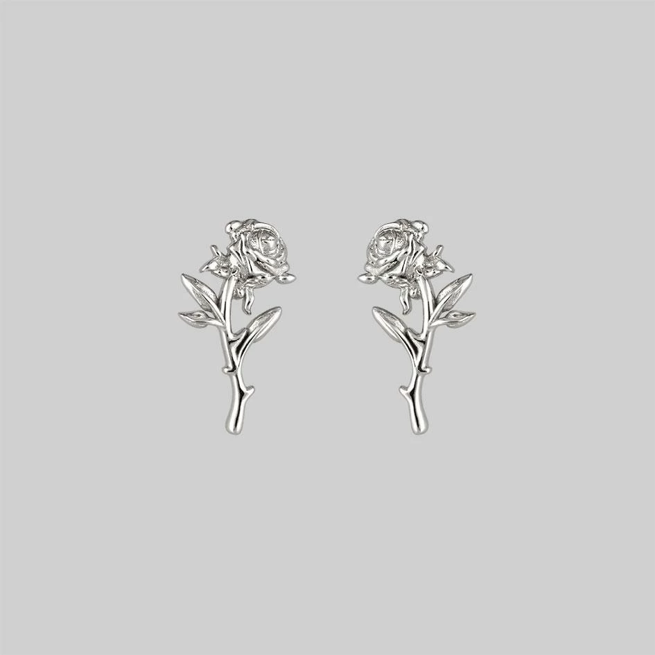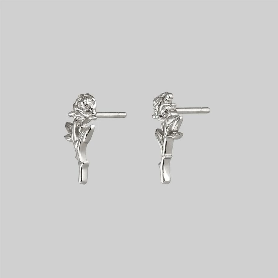 Intricate rose stem with leaf detail silver earrings.