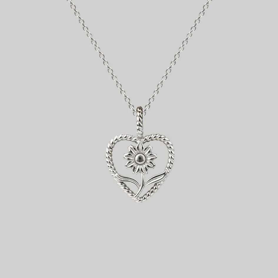 Heart framed sunflower with delicate twisted edge detail hangs from a delicate trace chain.