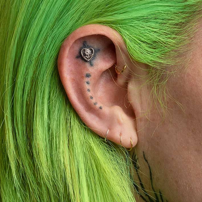See illustration for suitable piercing locations. Model wears in flat piercing.