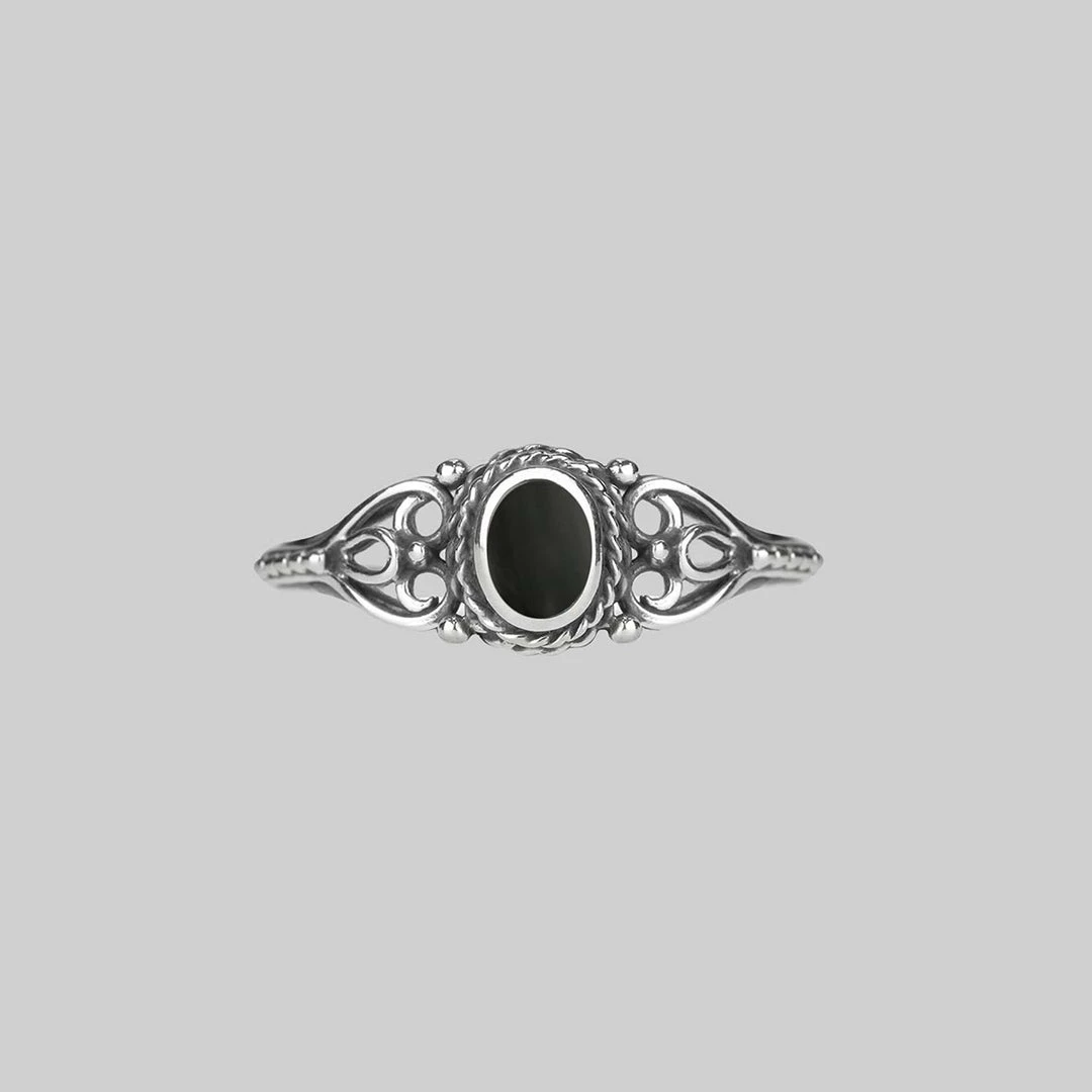 An intricately detailed ring featuring a dark and deadly Onyx gemstone. Delicately feminine with a lethal twist.