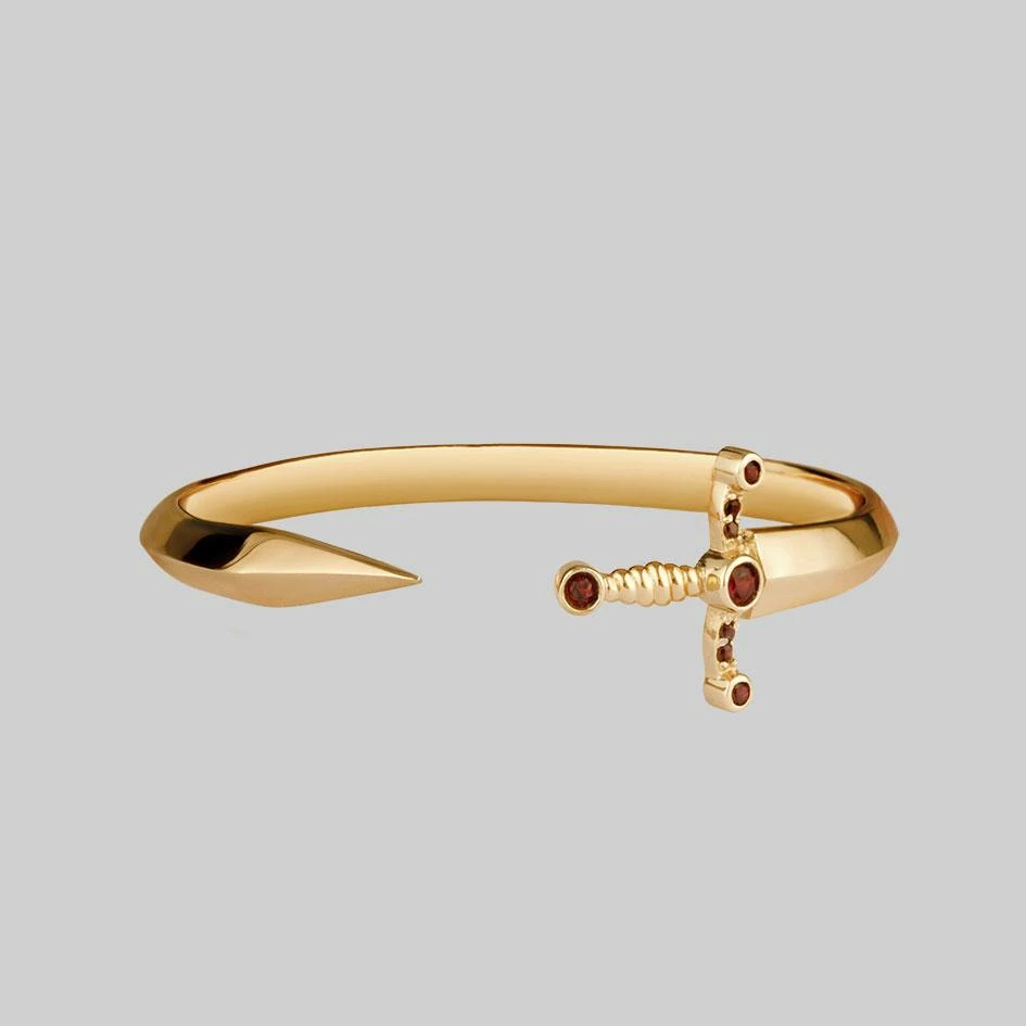 Fierce wrap-around dagger bangle, encrusted with natural Garnet gemstones.