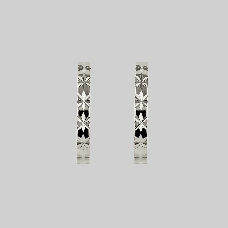 Silver hoop earrings featuring a delicate etched starburst pattern.