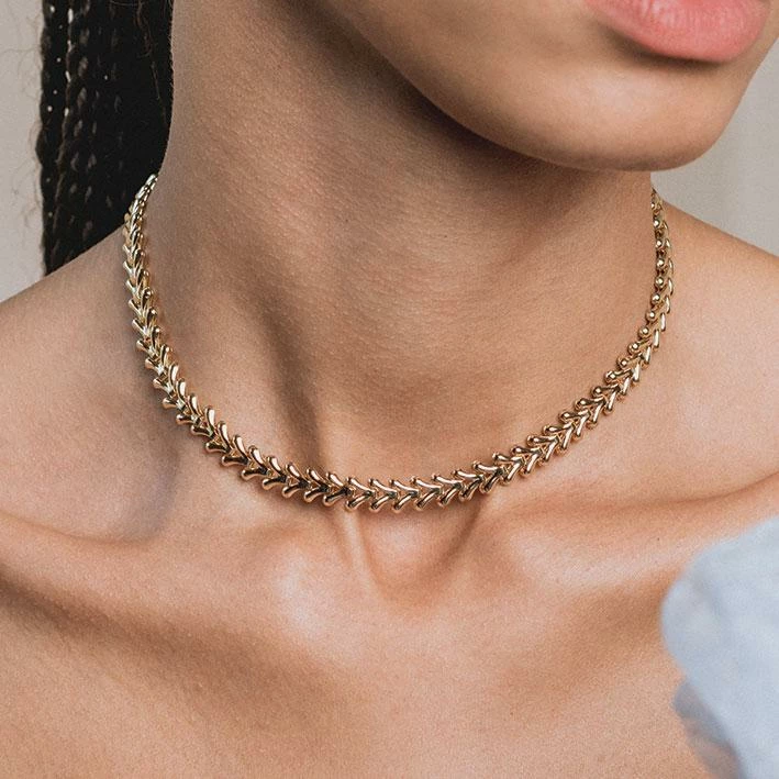Retro inspired lightweight v-link collar necklace. A subtle necklace with big impact, designed to sit elegantly above your collar bones.