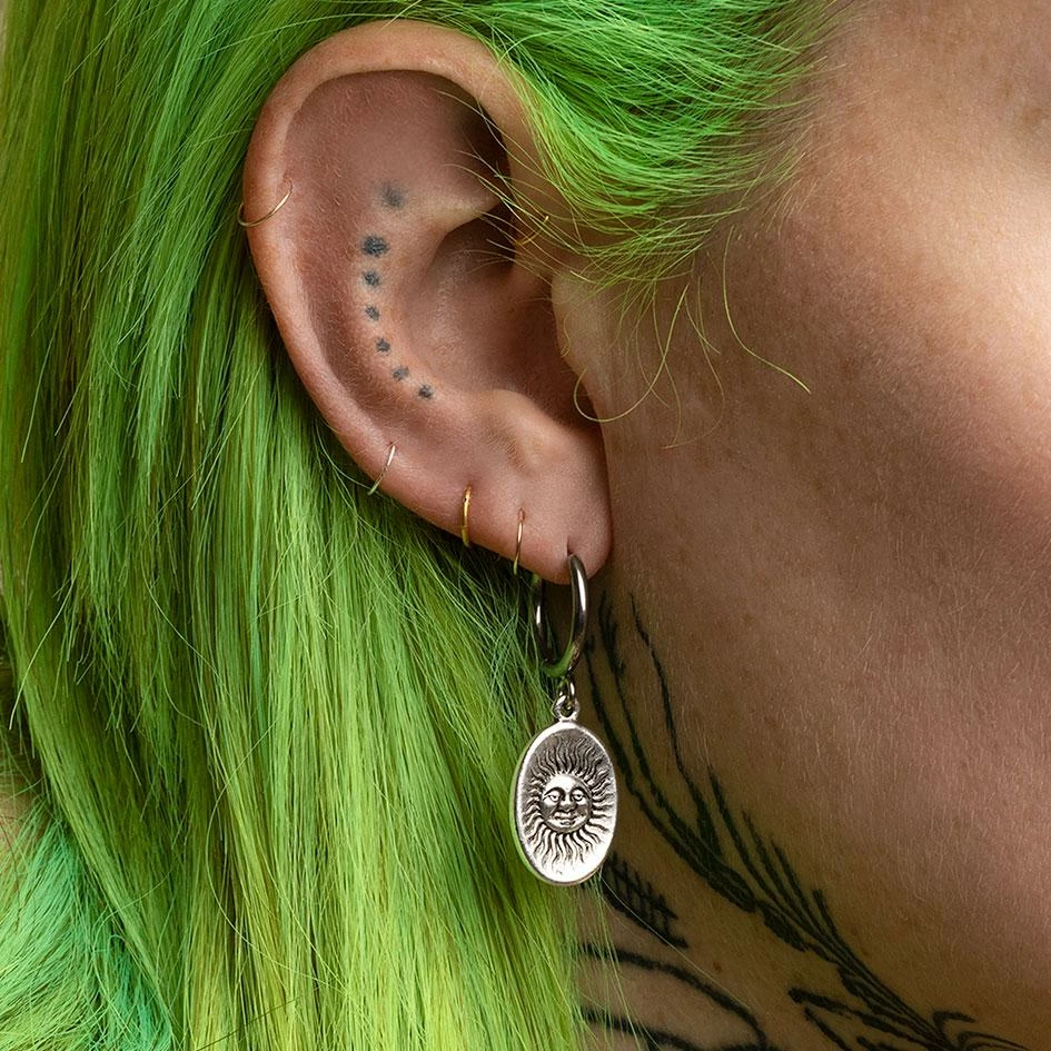 Celestial medallion sun hoop earrings with sweet little face detail.