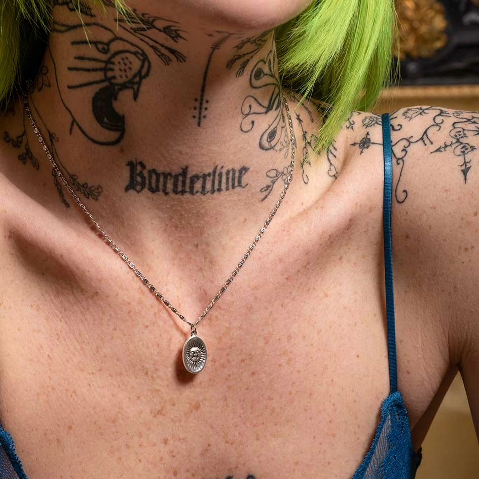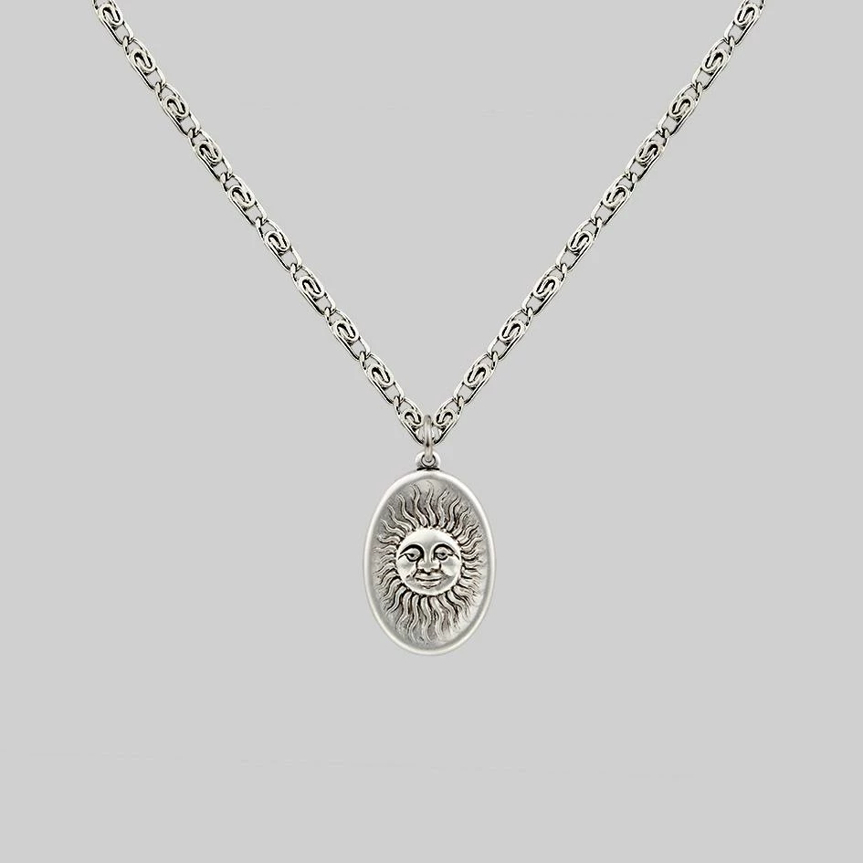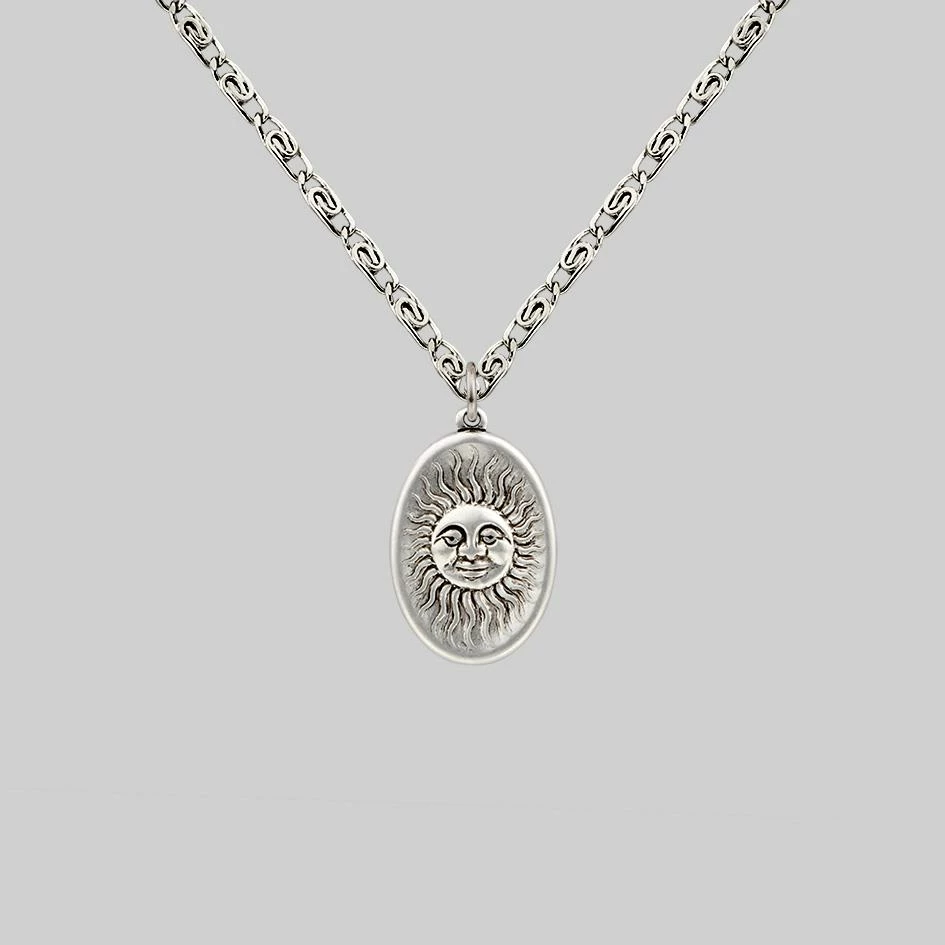 Oval celestial sun medallion with sweet little face detail hangs from a decorative snail chain.