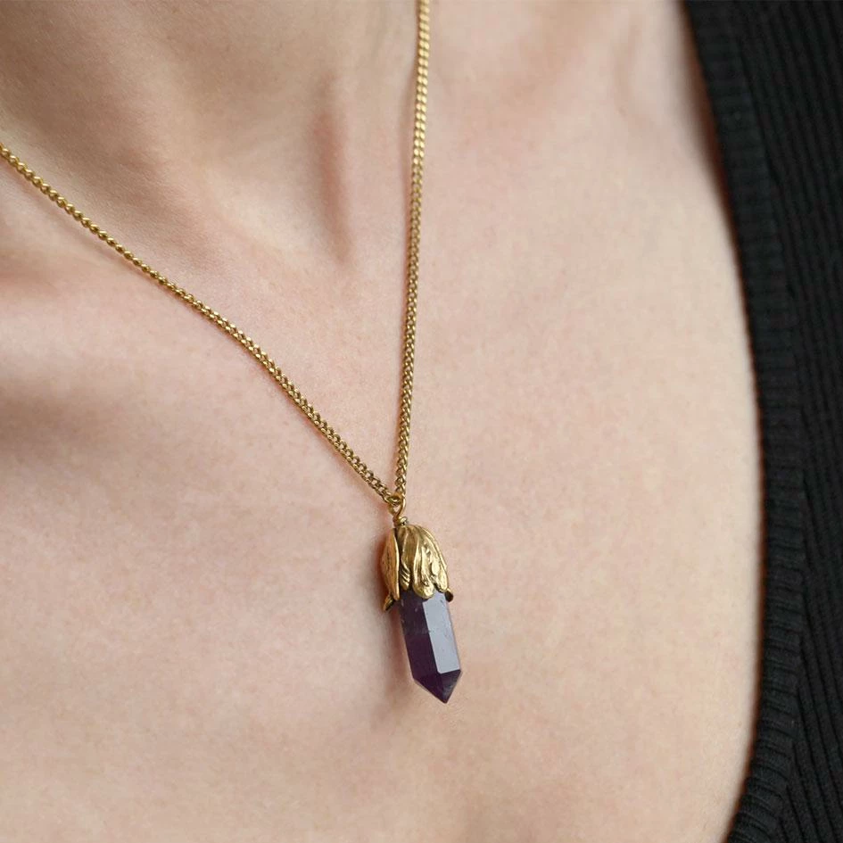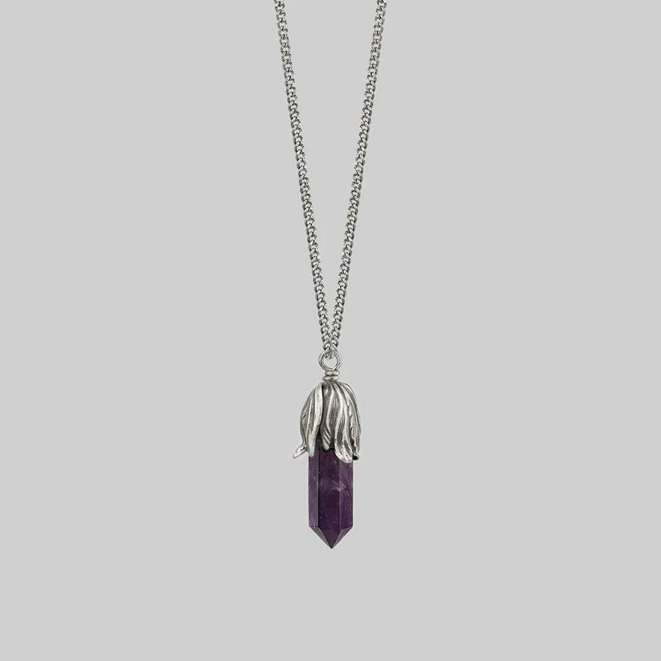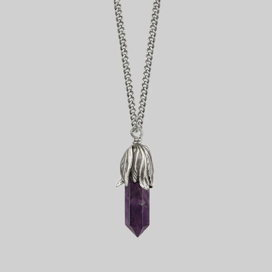 Amethyst gemstone shard encased within flourishing wild petals, hangs on a short adjustable chain.