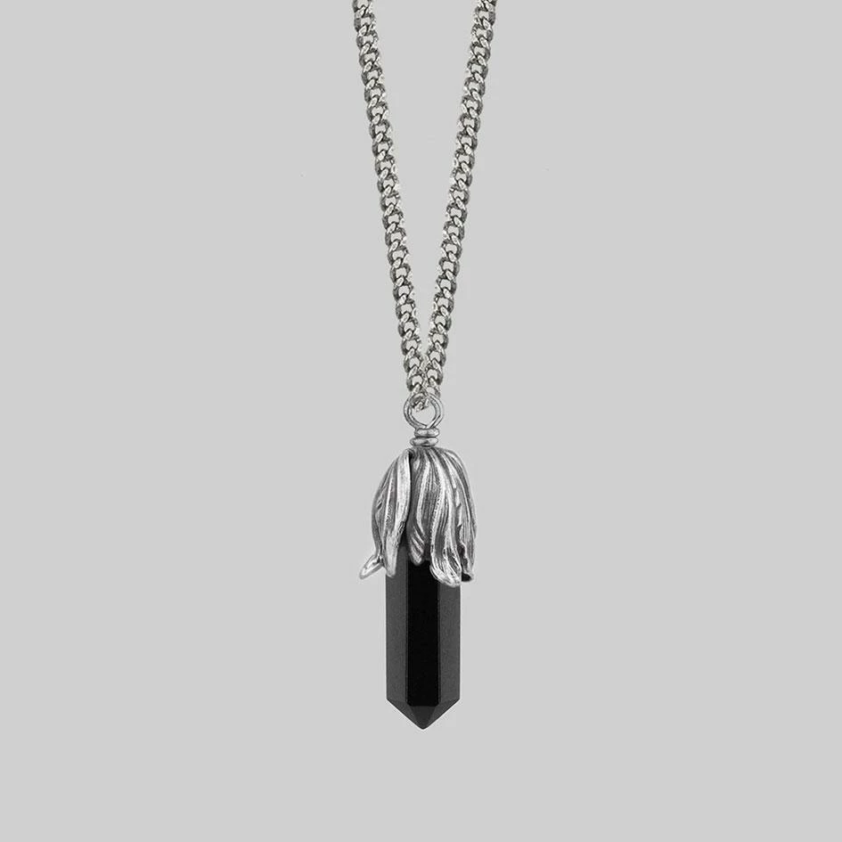 Black Agate gemstone shard encased within flourishing wild petals, hangs on a short adjustable chain.