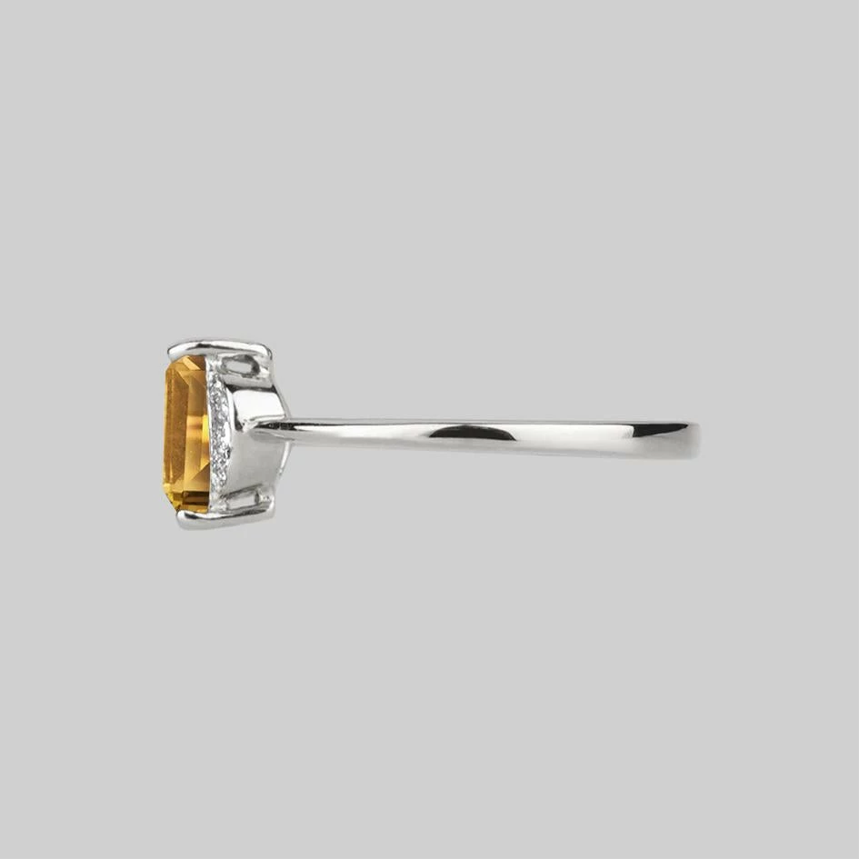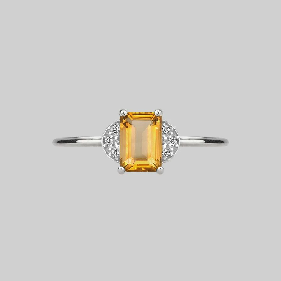 Inspired by Art Deco style this vintage style ring features decorative geometric symmetry. A claw set rectangular Citrine Quartz gemstone sits between two semi circles of Cubic Zirconia crystals.