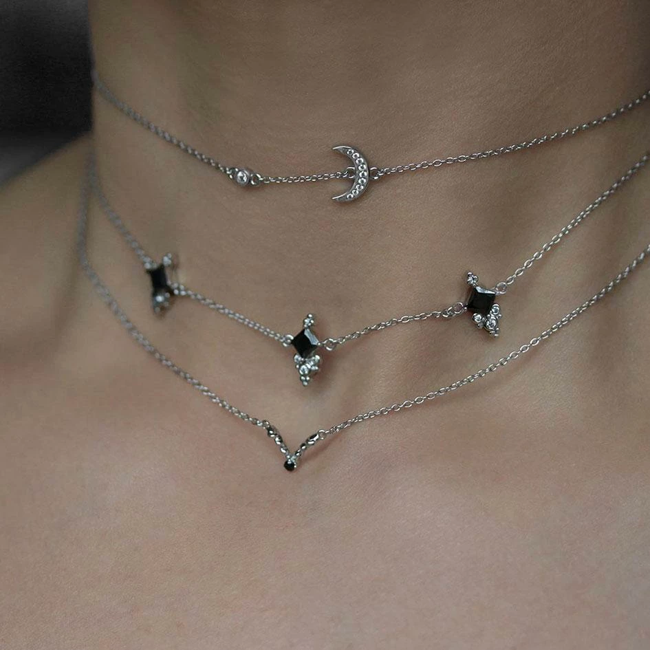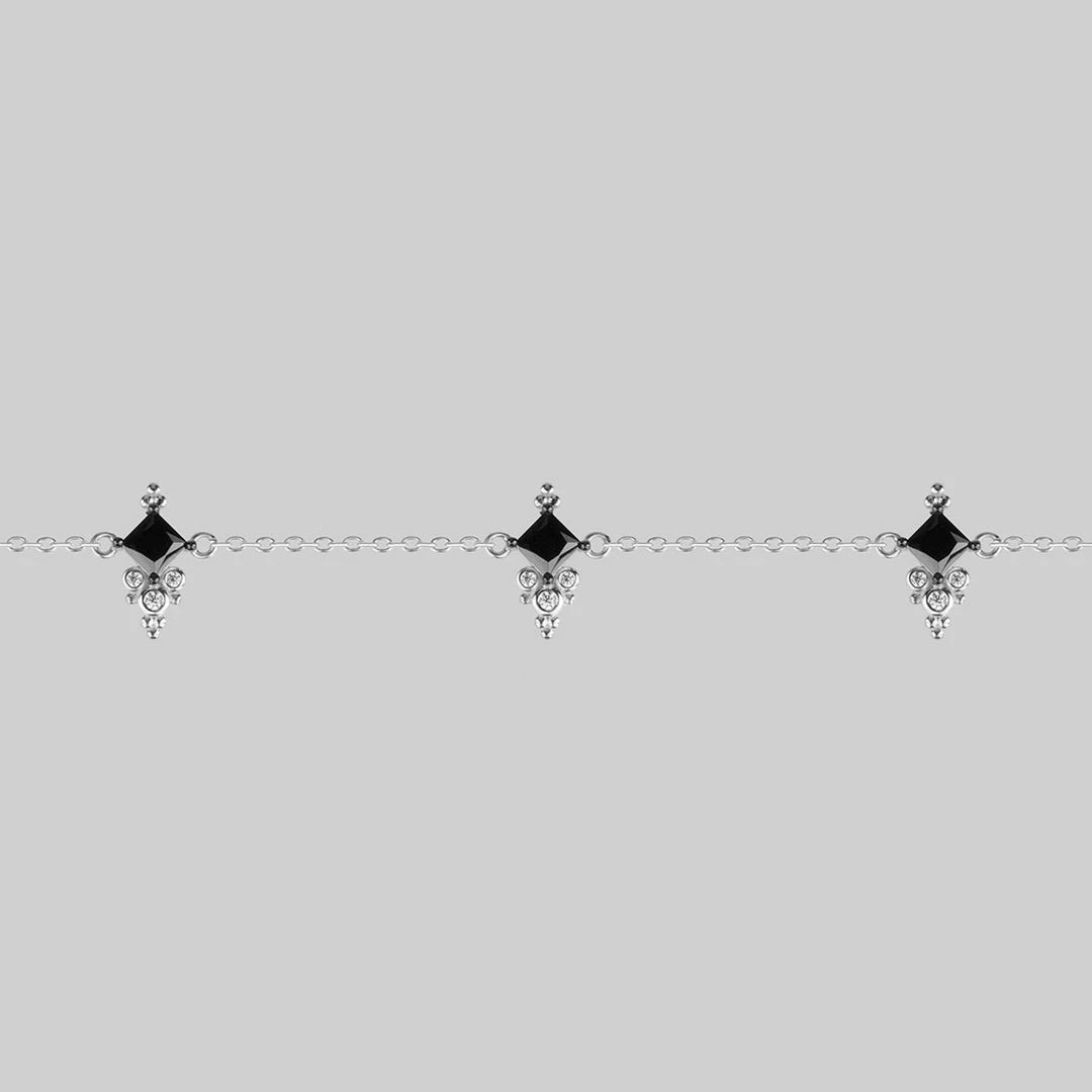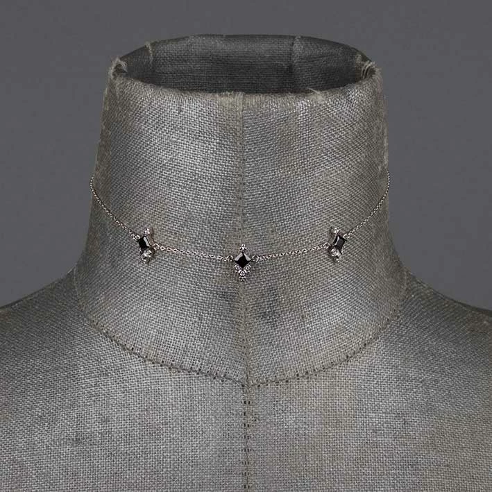 Sterling Silver chain choker featuring three diamond cut Black Spinel gemstones set amongst delicate detail and Cubic Zirconia crystal.