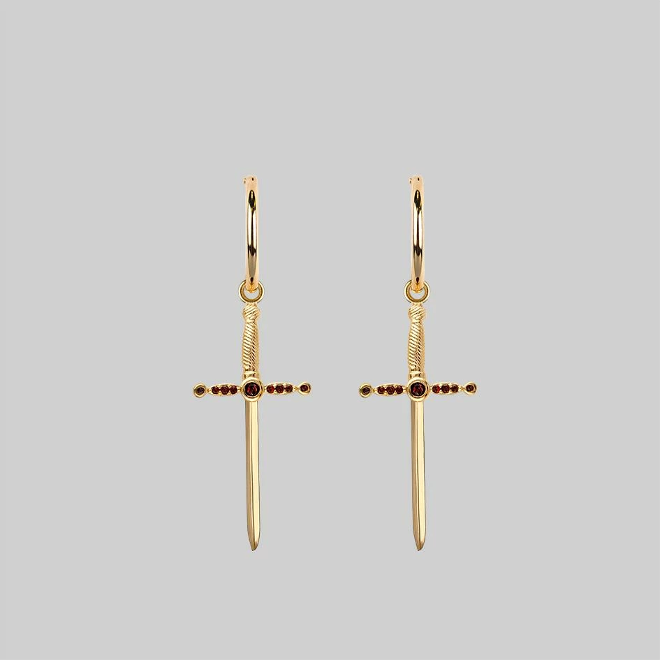 Deathly dagger hoop earrings encrusted with Garnet gemstones.