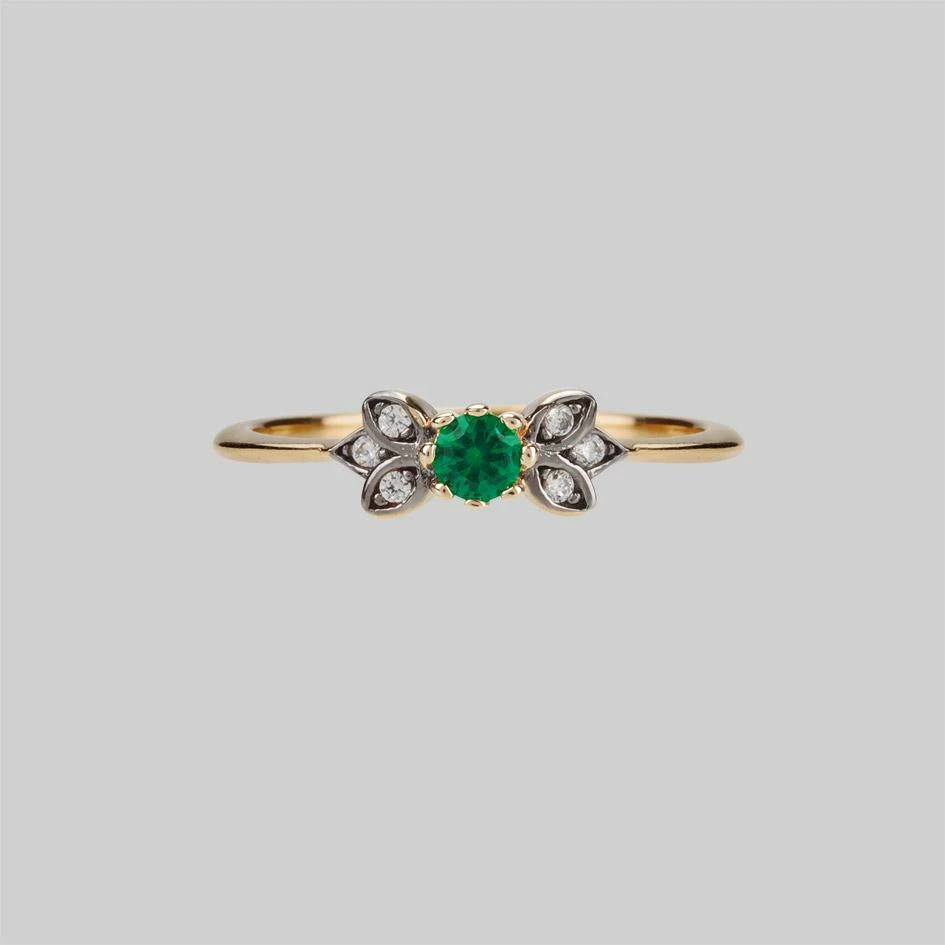 Vintage style leaf detailed ring featuring a vibrant Green Quartz center with tiny Cubic Zirconia crystals. A dainty, elegant & detailed classic design.