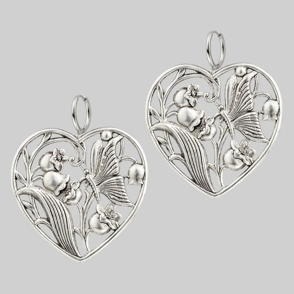 Huge heart statement hoop earrings featuring elaborate florals and butterfly detail.
