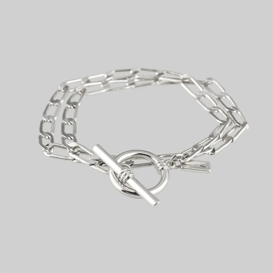 Double wrap layering curb chain bracelet featuring a T-Bar clasp.