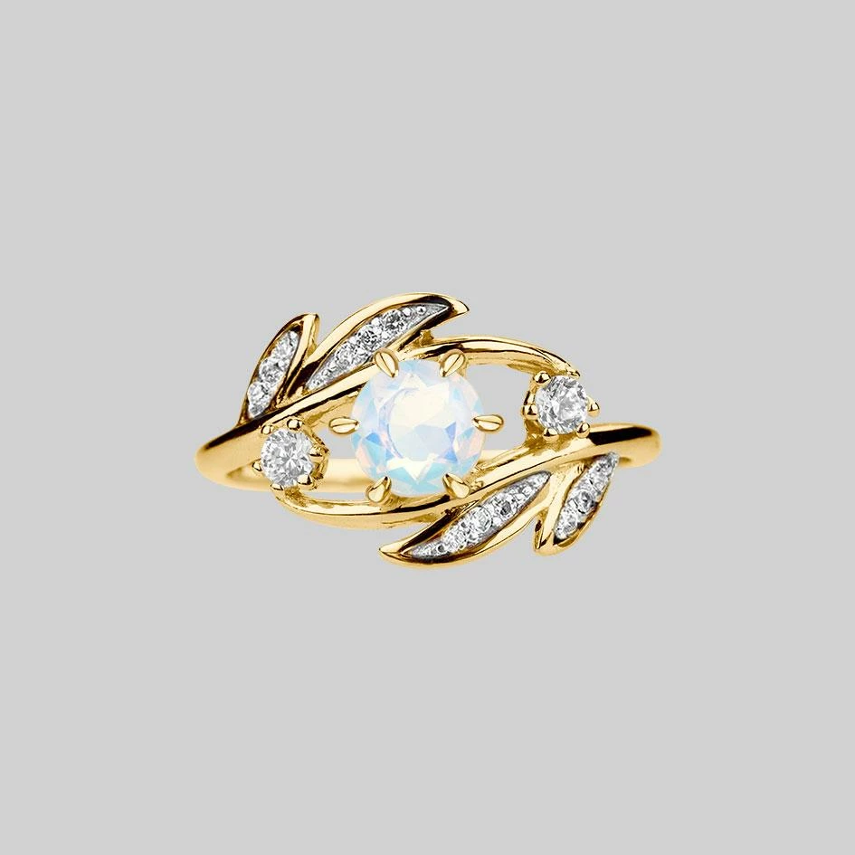 Inspired by eras past, this delicate yet stand-out design features a stunning cut Opal surrounded by luscious leaf detail encrusted with sparkling Cubic Zirconia.