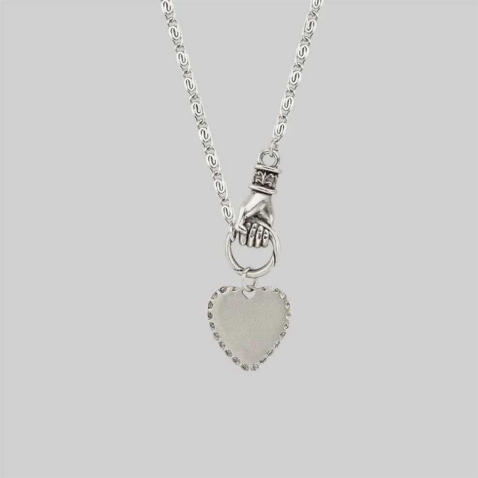 Layering necklace featuring a hand grasping heart pendant.