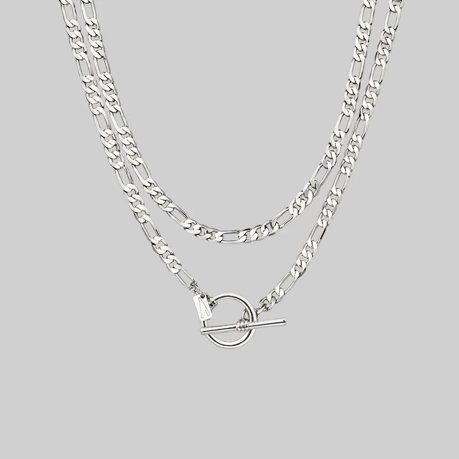 Silver double wrap curb chain necklace featuring a T-Bar clasp.
