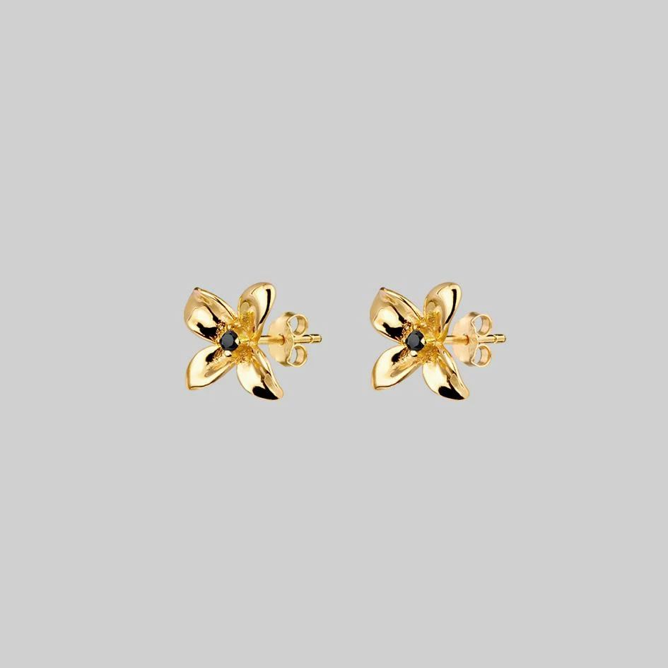 Clematis flower stud earrings in gold featuring a tiny Black Spinel gemstone centre.