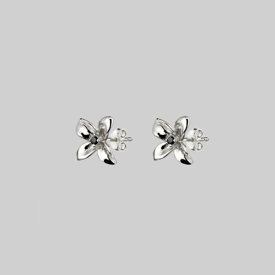 Clematis flower stud earrings in silver, featuring a tiny Black Spinel gemstone centre.