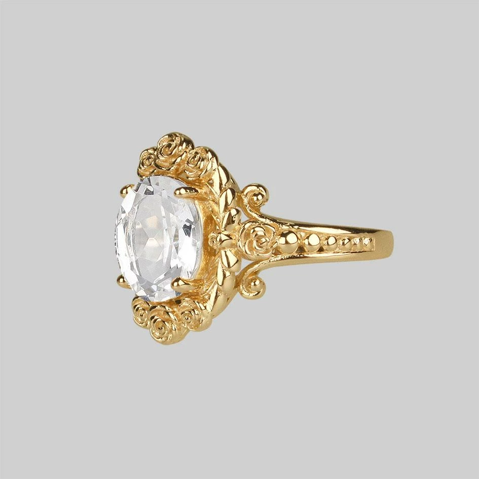 Luxurious vintage inspired ring featuring a large faceted Clear Quartz crystal set upon an ornately detailed shank within a rose wreath frame.