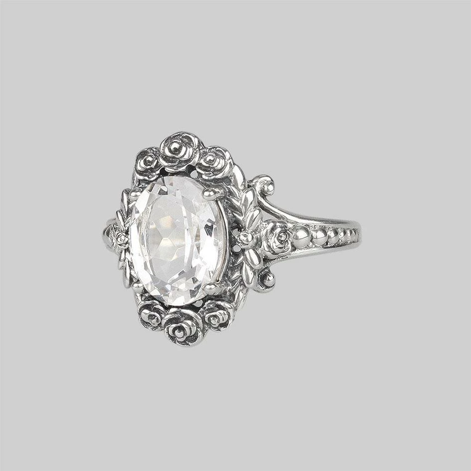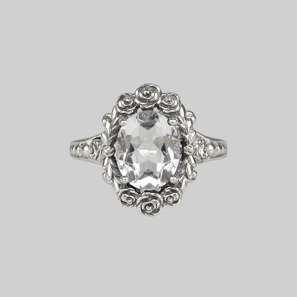 Luxurious vintage inspired cocktail ring featuring a large faceted Clear Quartz crystal set upon an ornately detailed shank within a rose wreath frame.