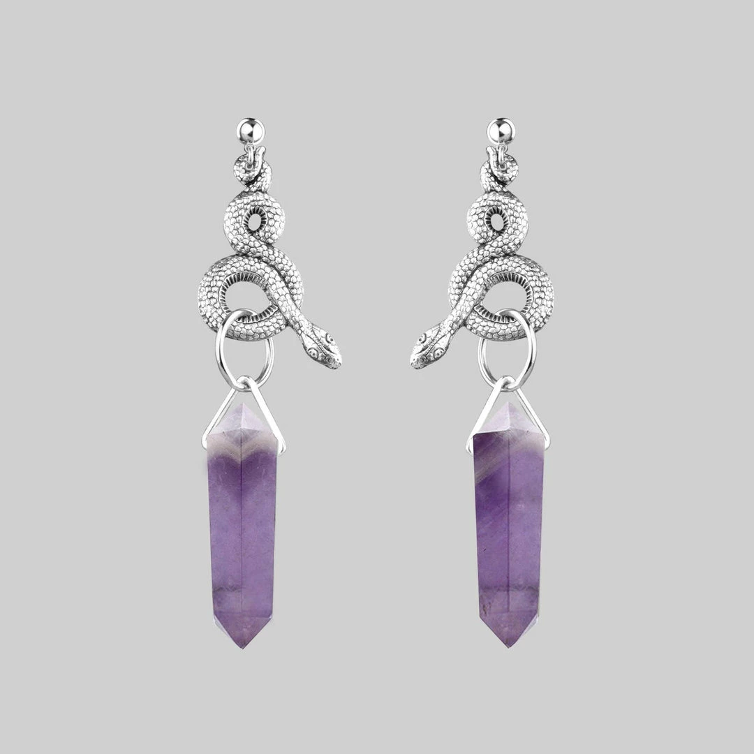 Antique sterling silver plated snakes. Stainless steel ear posts &Â barrel backs.Â