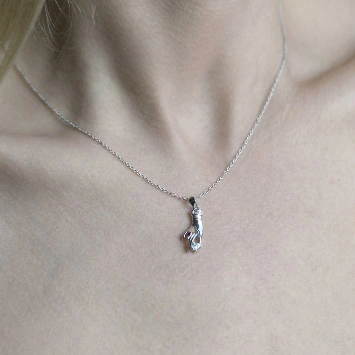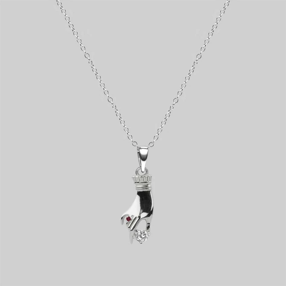 Victorian inspired necklace featuring a slender hand pinching a single sparkling Cubic Zirconia crystal. The hand features delicate lace cuff details and a deep Garnet gemstone ring.