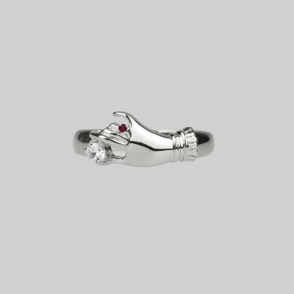 Victorian inspired ring featuring a slender hand pinching a single sparkling Cubic Zirconia crystal. The hand features delicate lace cuff details and a deep Garnet gemstone ring.