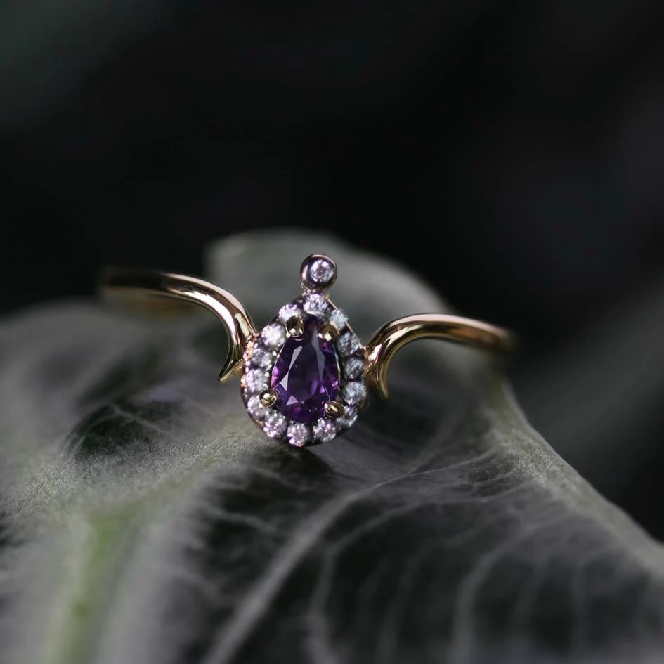 Vintage style elegant chevron ring featuring a tear drop cut Amethyst surrounded by tiny sparkling Cubic Zirconia crystal.