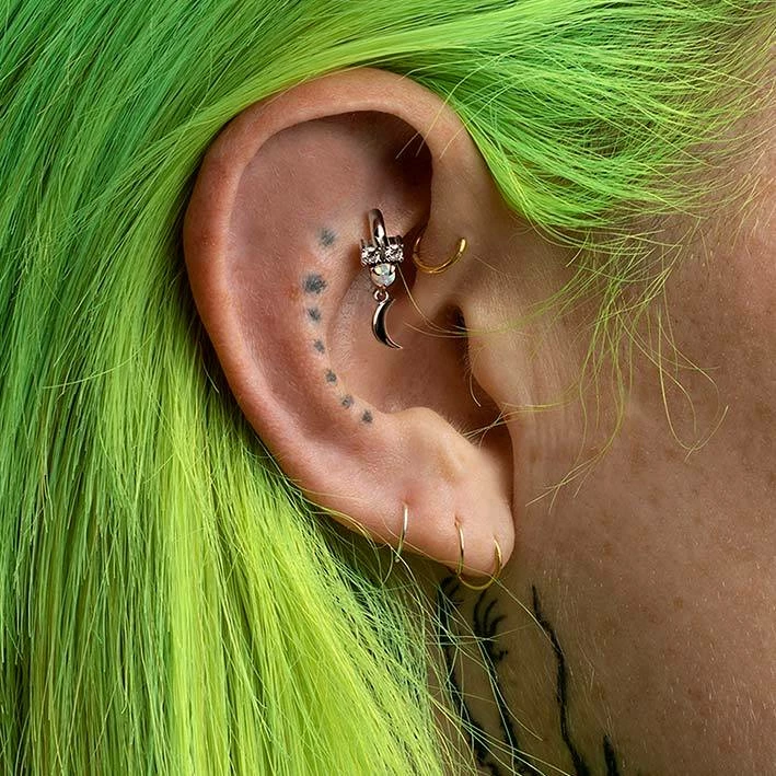 Can be worn in a forward helix, helix, rook, daith or tragus piercing.