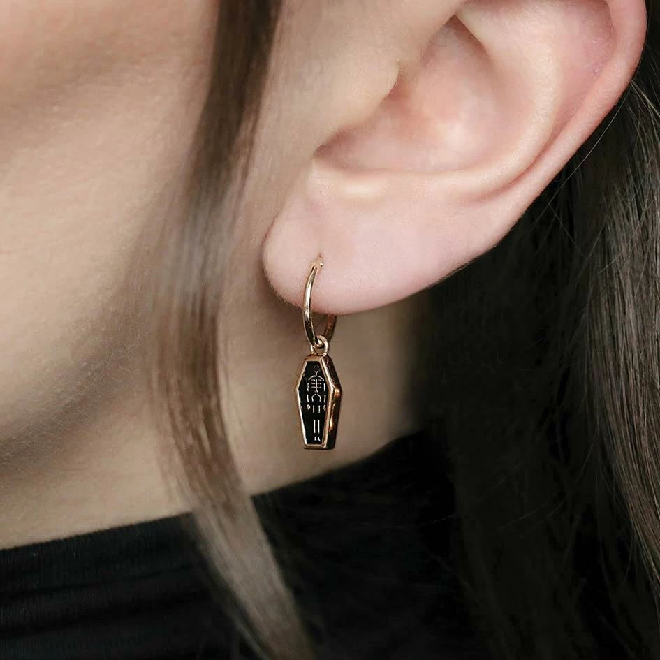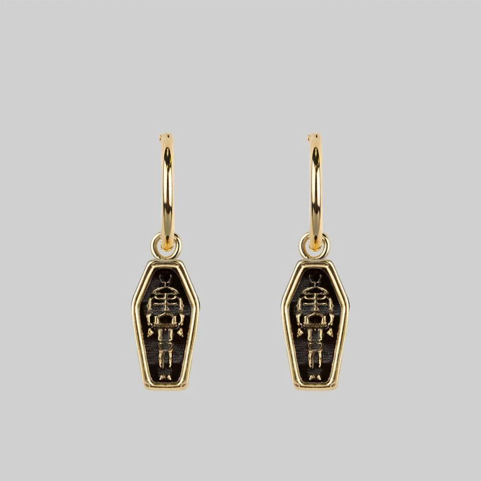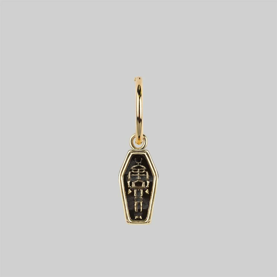 Delicate hoop earrings featuring tiny coffin charms encapsulating a delicate skeleton set behind enamel. Inspired by Mourning Jewellery worn to express the sentiment of death.