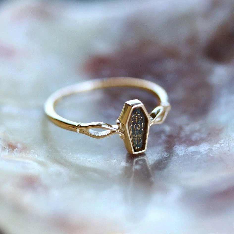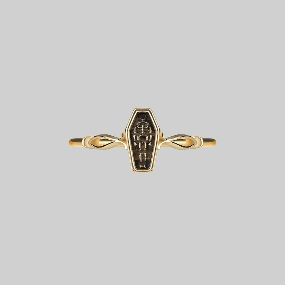 Delicate scroll shoulders hold a tiny coffin encapsulating a delicate skeleton. Inspired by Mourning Rings worn to express the sentiment of death.