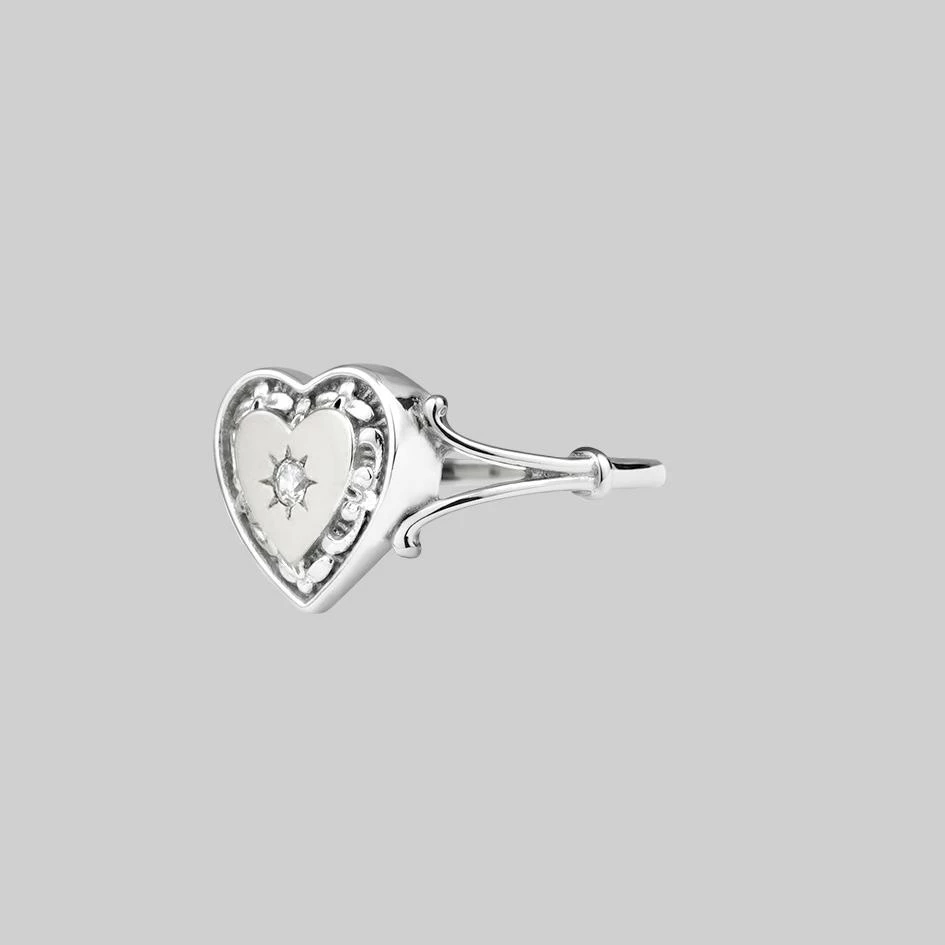Romantic heart with border detail featuring a starburst set tiny Cubic Zirconia crystal sits between ornate shoulders.