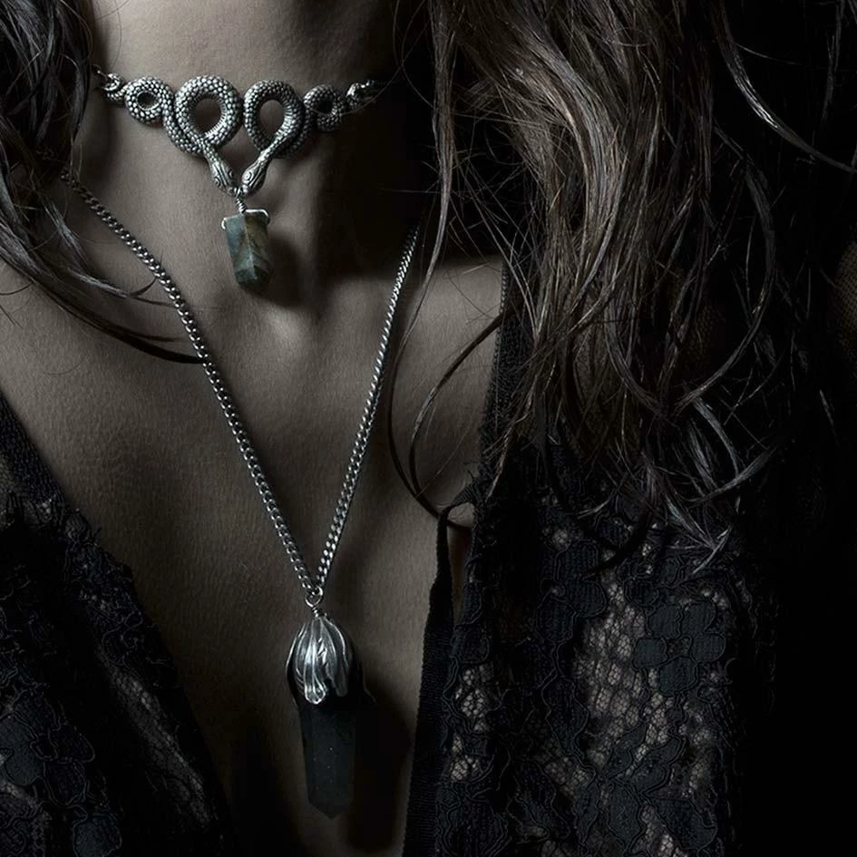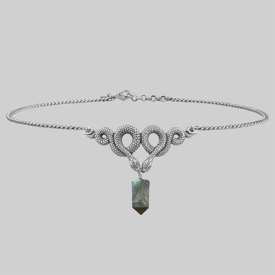 Antique silver deathly snake choker featuring a Labradorite gemstone point.