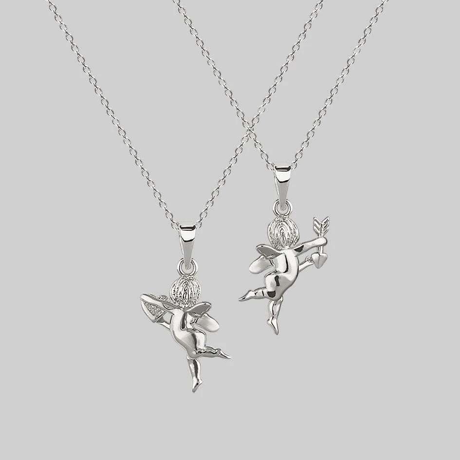 Mismatch cherub necklaces, inspired by the mythological tale of lovers Cupid and Psyche.