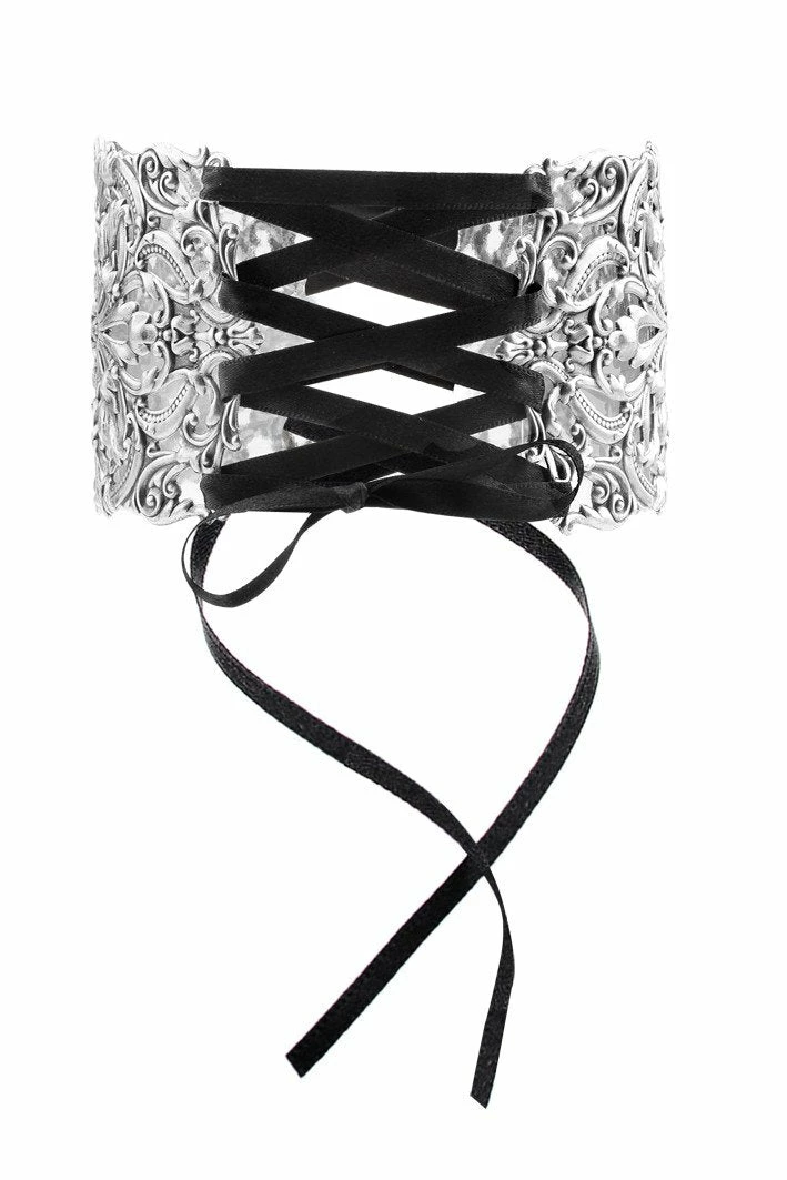 Grand Baroque lace up choker. Ornate antique silver detailing with satin ribbon lace up front and back.