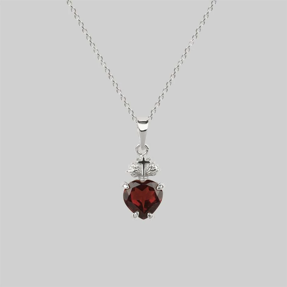 Delicate Sacred Heart necklace featuring a deep red Garnet faceted heart gemstone.