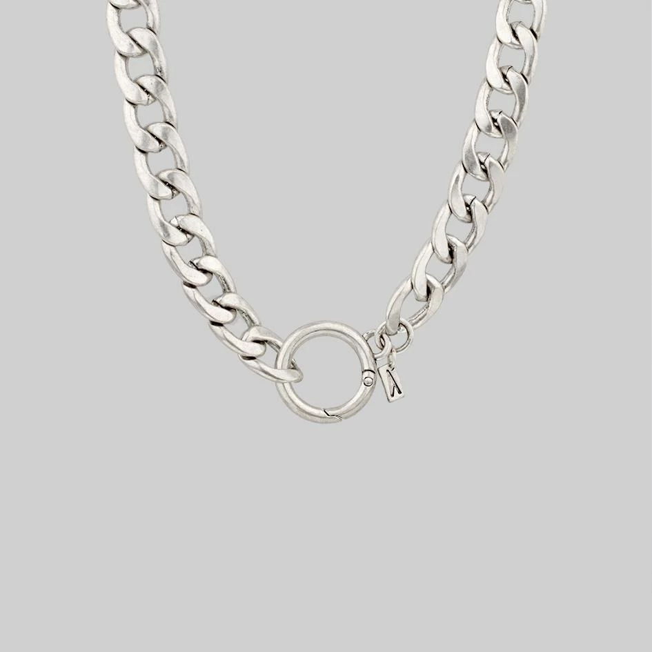 Chunky silver curb chain with circle clasp. This versatile piece can be worn in multiple lengths and even looks great wrapped around your wrist. Wear it solo or add more layers for the ultimate style statement..