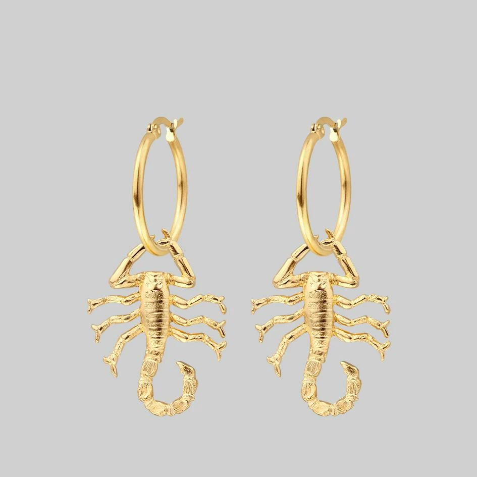 Fierce, gold scorpion hoop earrings.