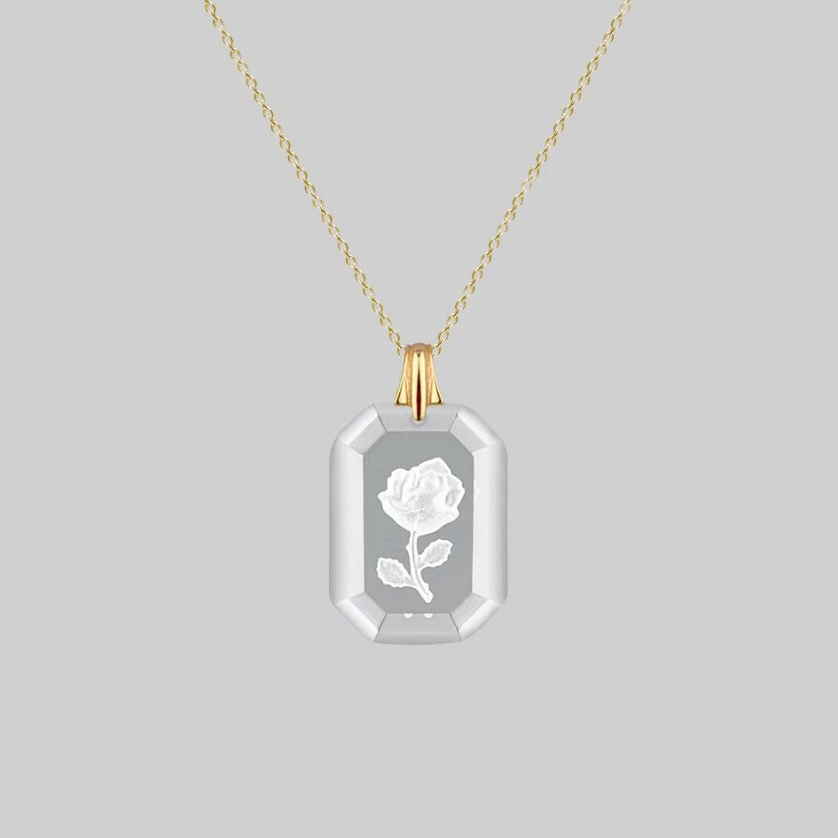 Vintage inspired Intaglio glass pendant featuring a single rose, hangs from a delicate trace chain. This necklace can be worn either way around, showing the engraving from the front, or turned around; showing the engraving through the glass.