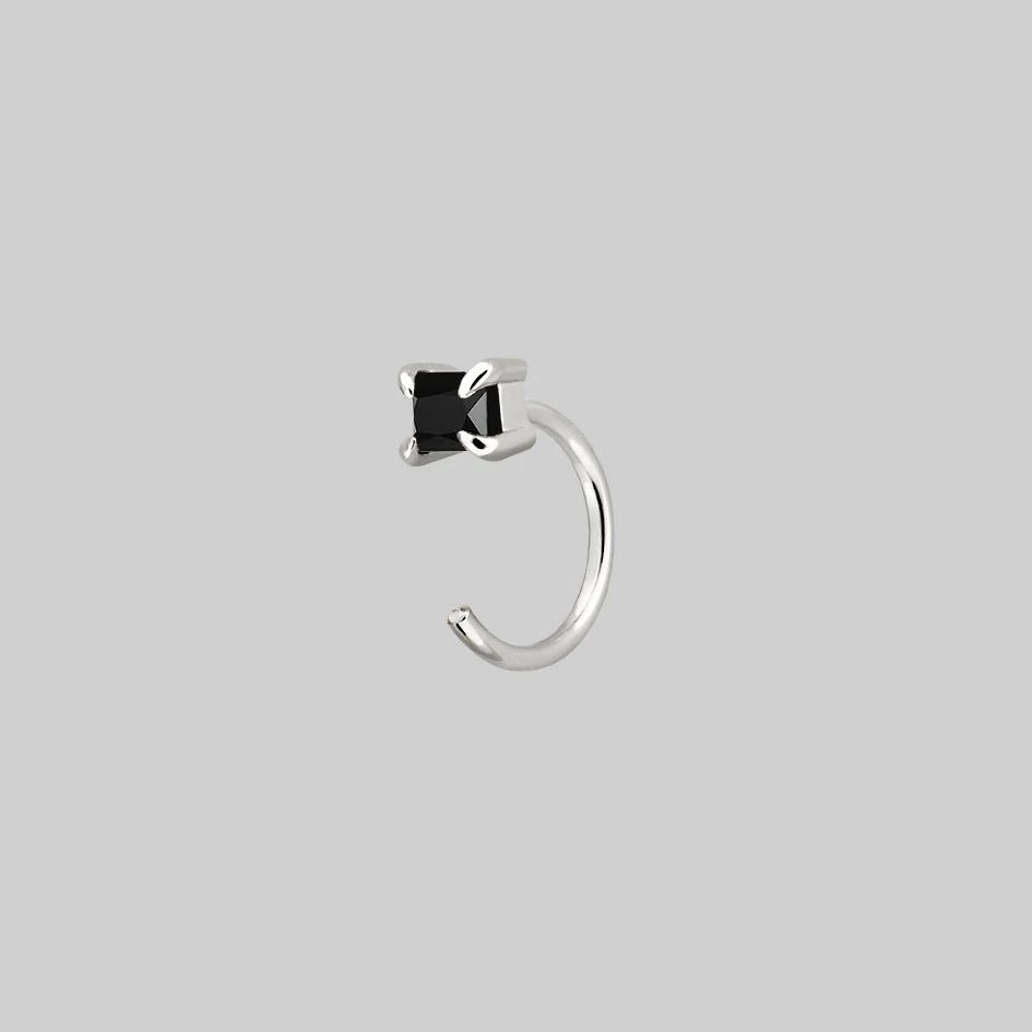 Silver huggie hoop earrings featuring a rectangle-cut Black Spinel gemstone. Simply pull the open hoop through your piercing to the end. Slightly adjustable.