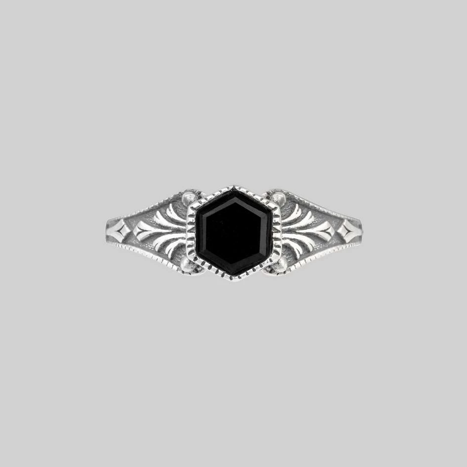 Vintage inspired ring featuring ornately decorated shoulders around a bezel set hexagon cut Onyx gemstone.